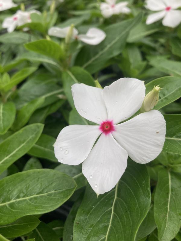 Vinca trailing, specifically the Cora Cascade variety, is a charming addition to any garden or container. Known for its vibrant Polka Dot color pattern, this plant features striking white blooms adorned with deep purple centers, creating a delightful contrast that will catch the eye.