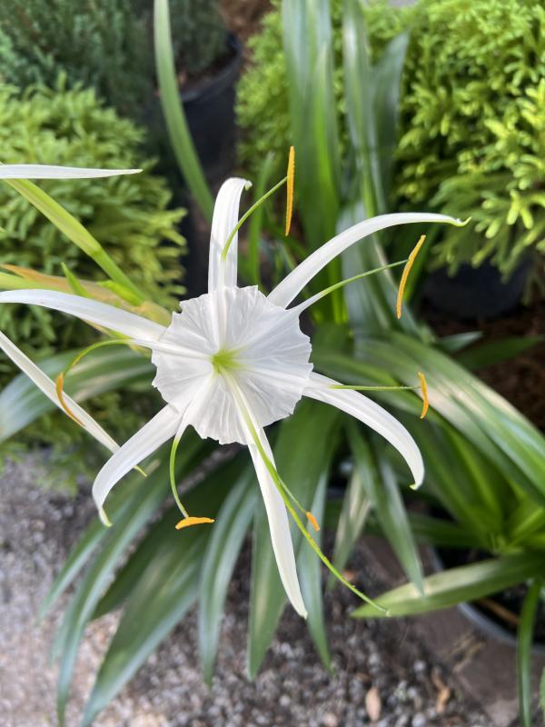 The Spider Lily is a striking perennial known for its elegant, arching leaves and stunning white blossoms. This variety, renowned for its delightful fragrance, adds a touch of sophistication to any garden space.