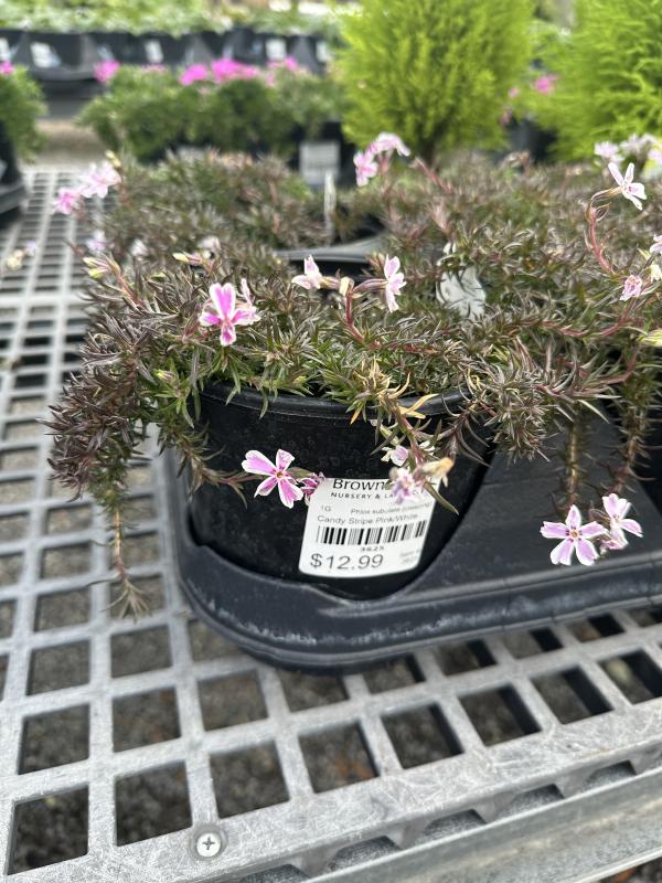 Phlox subulate, commonly known as creeping phlox, is a delightful addition to any landscape. The 'Candy Stripe' variety features charming pink and white flowers that create a vibrant display in spring. This perennial ground cover thrives in full sun to partial shade, making it versatile for various garden settings.