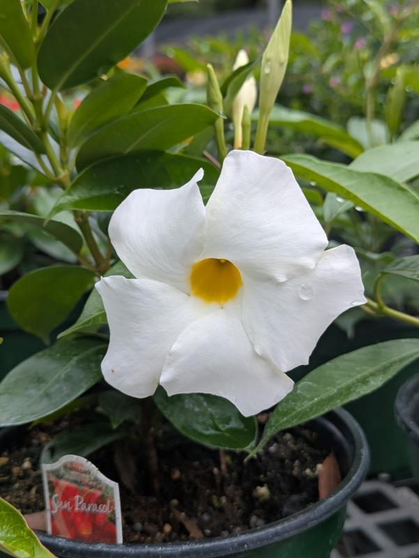 The Mandevilla 'Sun Parasol' is a stunning climbing vine known for its striking white blooms that add elegance to any vertical space. This variety thrives in sunny conditions, making it an excellent choice for patios, trellises, or garden walls.