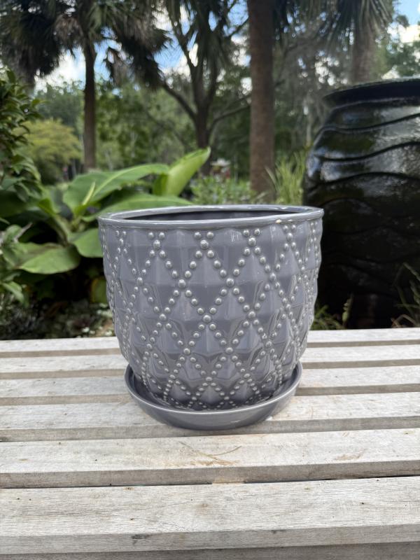 Planter w/ Saucer Beaded Diagonal Grey 10.25" X 9"