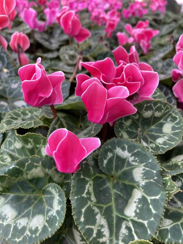 The Cyclamen is an exquisite annual plant known for its striking blooms and unique foliage. This particular variety, Flame / White Trim, features vibrant flowers in an assortment of colors that can brighten any space.